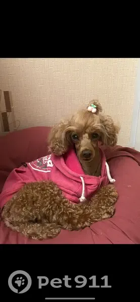 Той-пудель, красный цвет. Кличка Соня. Убежала от двери под’езда, испугалась хлопка двери автомобиля. На собаке надета розовая кофточка, хвостик на голове с розовой резинкой. Собака без ошейника, без шлейки. Шли с ней из вет лечебницы. Собака пугливая, болеет, без мед помощи погибнет. Пожалуйста, помогите