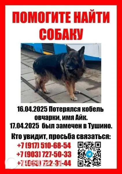 Потерялся 16 апреля, зовут Айк, овчар в стрессе очень быстро перемещается. Живёт в районе Октябрьского поля на Маршала Рыбалко в Москве. 16 апреля утром ехал в трамвае, его высадили в Братцево. Пытался найти знакомые места, бежал. 17 апреля попал в округ Химки - по Пятницкому шоссе в сторону Зеленограда добежал до Брёхово и Рузино. 18 апреля утром быстро двигался в обратном направлении вдоль Пятницкого шоссе в сторону Москвы, с 8 утра в районе Светлых Гор Красногорского округа (в координатах 55.888692, 37.305062) след Айка потерян. Собаке 10 лет, в стрессе, пробежал несколько десятков километров в поиске дороги домой, голоден. Убегает от людей при попытке приблизиться. Необходимо сообщить местоположение, если заметили его, по возможности, с расстояния проследить его маршрут до приезда хозяина. В ошейнике. На языке есть чёрное пятно. Очень любит лазерные указки. Не кастрирован. От клещей обработан. Чат поиска: https://t. Me/+R_Cjfrt6mA05ZDNi