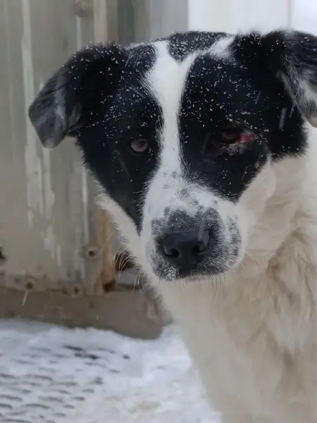 Размер средний, окрас белый в черную точку, мордочка черная, разделена белой полоской на две половинки. На спинке черное пятно.