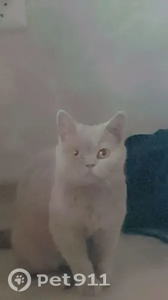 Шерсть серого цвета, без пятен. Порода Шотландская. Иногда может высовывать язык. Левая передняя лапка меньше других (недоразвитая). Глаза желтого цвета. Без ошейника.