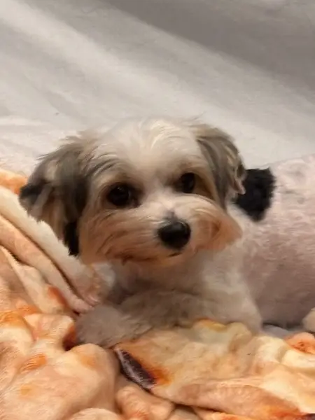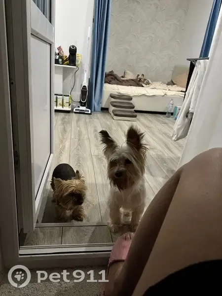 Беленький с черными ушками и темным пятнышком на левом боку, похож на йорка или бивер йорка( к сожалению в породе не сильна), мальчик очень ласковый и добрый, немного пугливый, купается спокойно но когда дело доходит до головы то очень сильно вертится, не нравится ему эта зона для мытья) На левом глазике нижнее веко беленькое, когти тоже разного окраса, зубки хорошие, думаю не совсем старый, лет 5-6(могу ошибаться) Ладит с другими животными и детьми, очень контактный и дружелюбный!