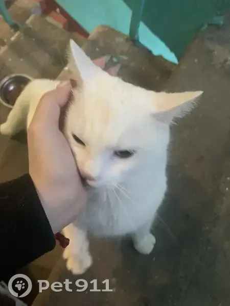 Полностью белая кошка, желтые глазки. Очень напуганная и голодная, по характеру ласковая. Сразу далась мне на руки. Нашли её в районе 12-ти часов утра, на пролёте между третьим и вторым этажом. На данный момент находится на 5 этаже.