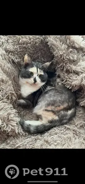 Серая в разноцветные разводы с интересной белой мордочкой и черным носом , стерилизована.Вышла из квартиры.