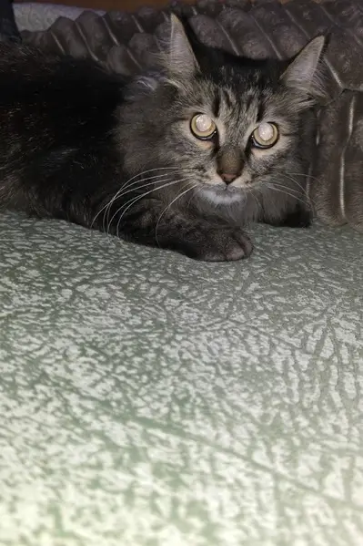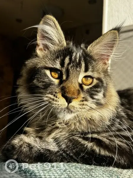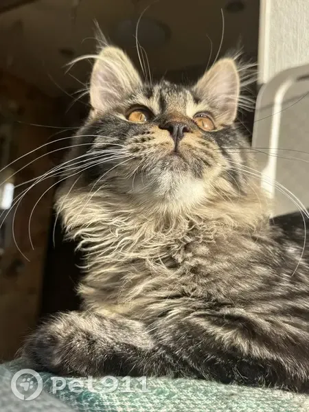 порода Мейнкун, окрас в полосочку, ближе к серому и чёрному. Пушистый хвост, карие глаза. Скорее всего выбежал на улицу с квартиры, кот доверчивый, кто-то возможно мог забрать