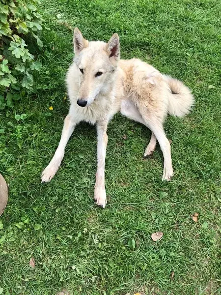 Лаечного типа, окрас палевый, кобель, худощавый, осторожный, кличка Норд. На нём ошейник чёрный с оранжевыми полосами, с никелированной защёлкой. Убежал к собакам.
