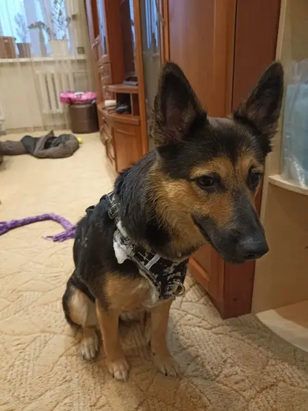 Он был в бирюзовой шлейке, мальчик, окрас овчарки немецкой, гладко шерстный.