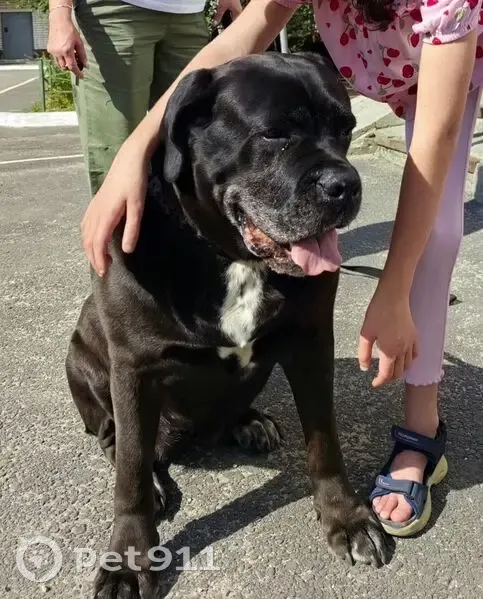 Окрас черный, с белым пятном на груди, седина на морде, собаке 12 лет, весит около 70 кг. Собака крупная, очень добрая и ласковая. Хвост купирован, уши не купированы. Убежала с участка, скорее всего за другим животным.