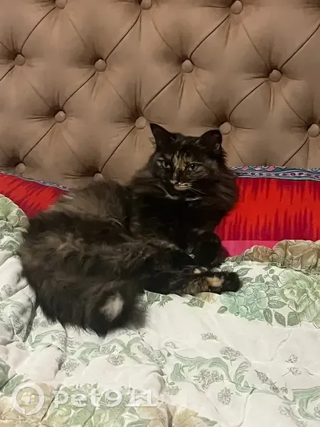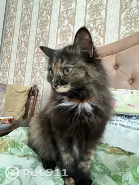 Окрас трёхцветный, на шее и на кончике хвоста белая шерсть, глаза зеленые, ошейника нет. Пропала 2 дня назад, при обычных обстоятельствах - вышла погулять вечером и не возвращается третий день