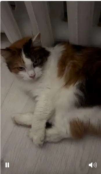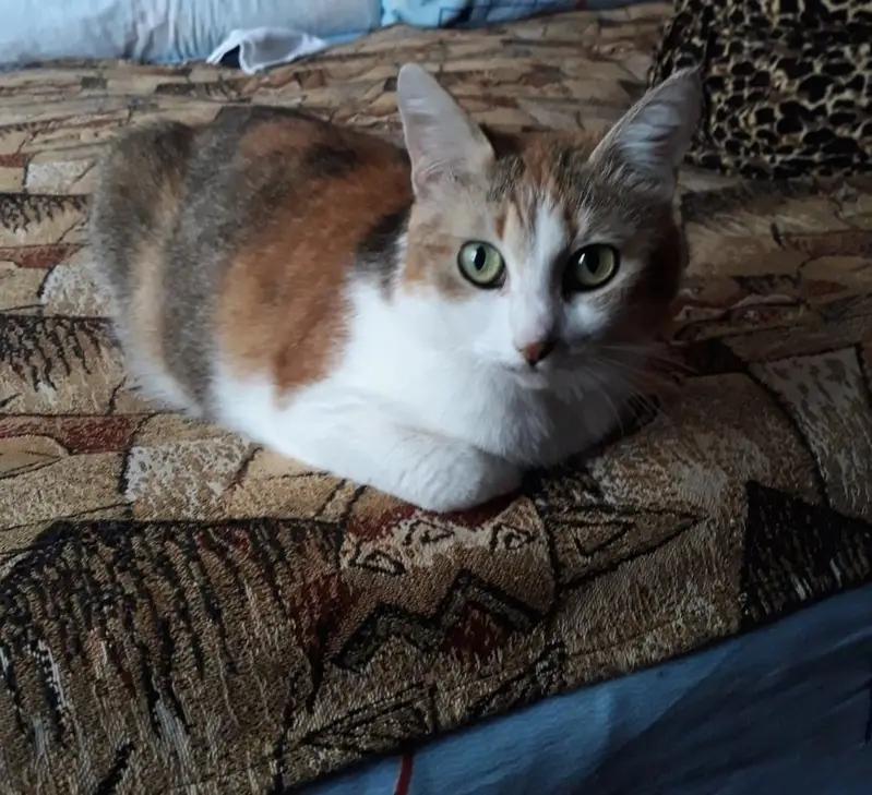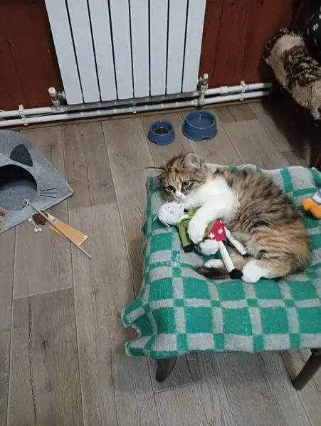 Молодая, выглядит очень ухоженно. Очень пушистая, длинношерстная