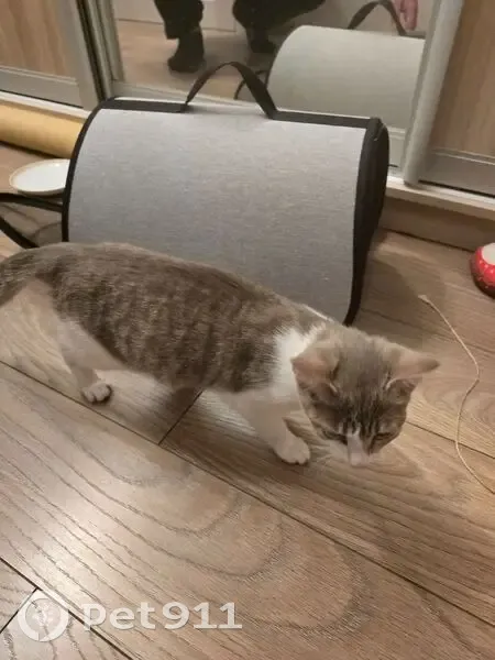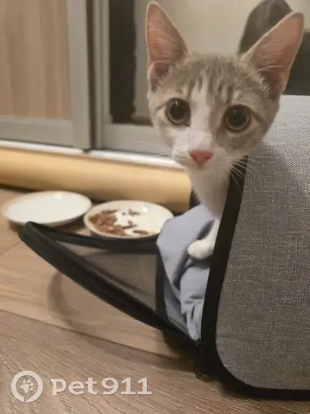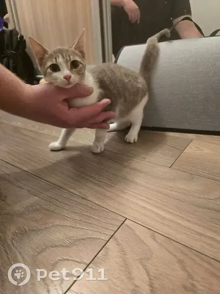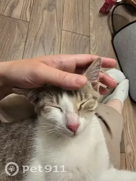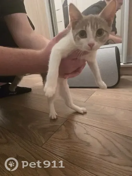 Окрас бело-коричневый. Глаза зеленые. Возраст 4-5 месяцев. Просто замечательная кошка. Ухоженная, домашняя, сразу на руки идёт, спит только на руках. В кустах мяукала, дрожала. Видно, что на улице первый раз. Лапы, хвост, глаза чистые, когти подстрижены, ходит в лоток.