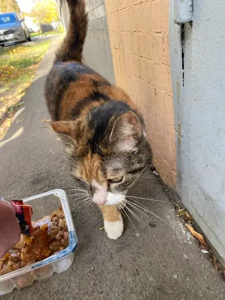 Миниатюрная кошка в рыжем ошейнике против блох. Сидит у Сбербанка, очень ласковая, идет на руки, людей не боится