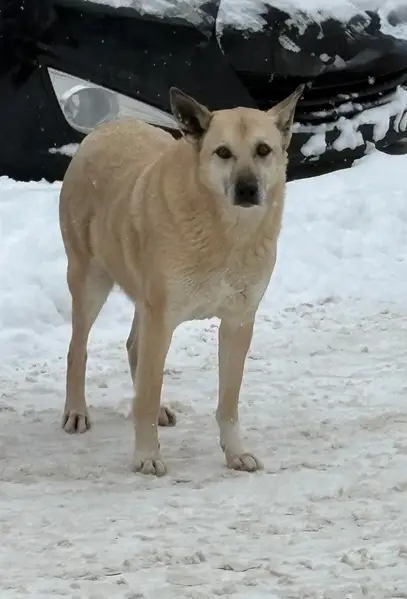 Найден молодой кобель светло бежевого окраса в коричневом ошейнике, рост до колена. Пугливый, но совсем не агрессивный. Клейма нет. Помогите найти хозяина или новый дом.