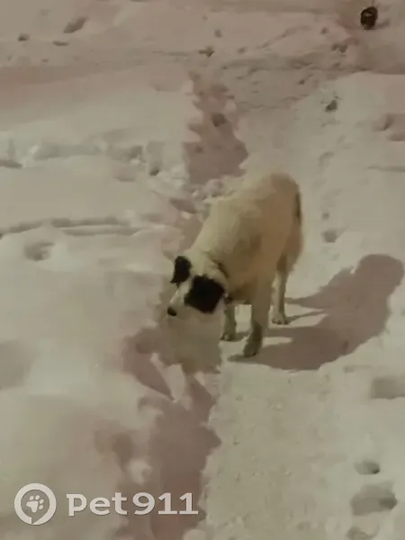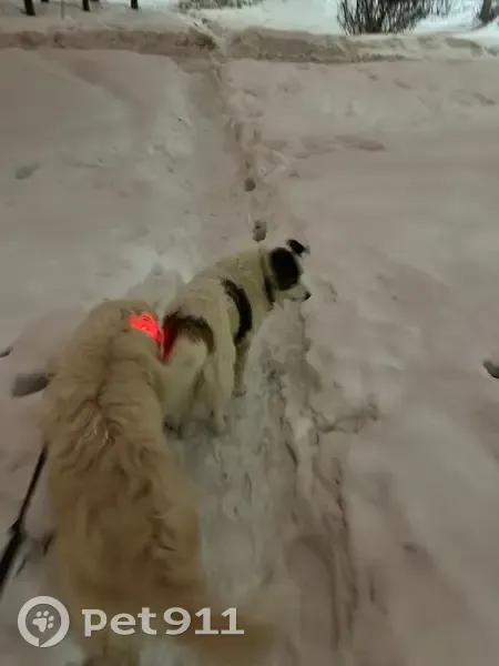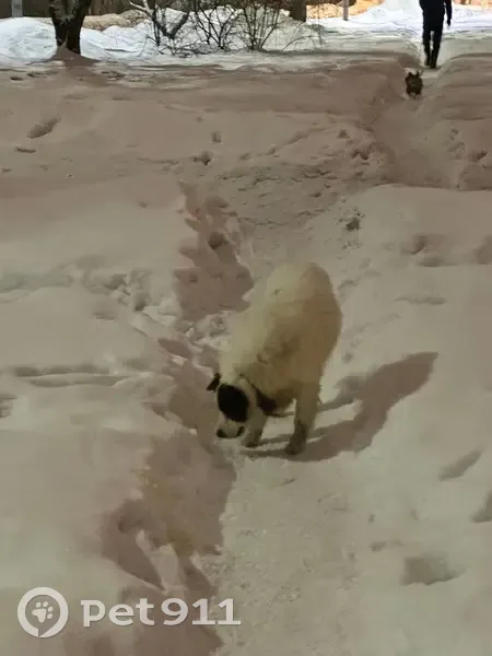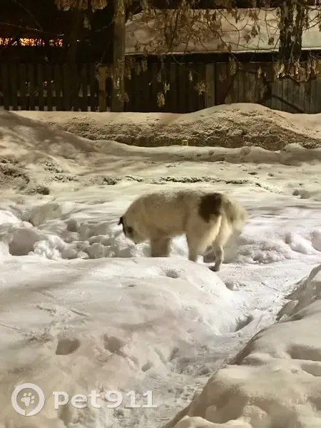 Замечен милый и неагрессивный пес, широкий кожаный ошейник без адресника. Пятна на ушках и у хвоста плюс на боку. Расцветка белый с коричневым.