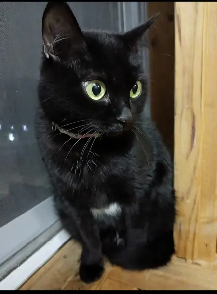Чёрный, крупнее обычных, похож на бомбейского кота, без белых пятен. Примерно 1,5 года. Утром кричал под окнами у 22 подъезда, позвала его через окно (1 этаж), он запрыгнул. Очень красивый,грациозный, умный, домашний кот