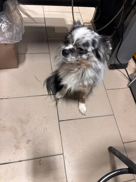 Найден мальчишка-шпиц. Черно-белый. Без ошейника. Шерстка в колтунах. Ищу хозяина