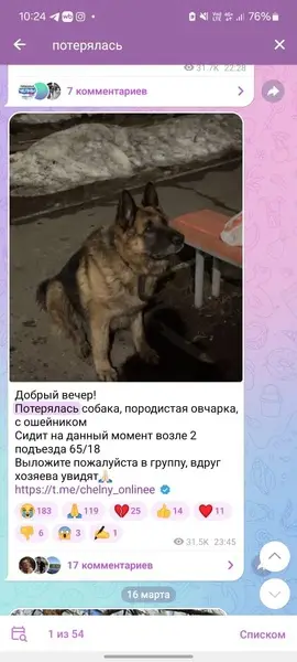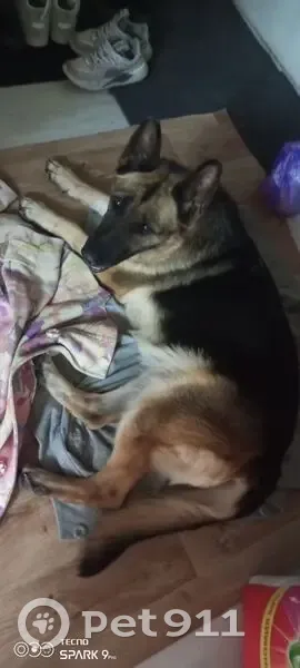 Найдена Овчарка на трассе около елабуги, сука до4 лет, на языке есть чёрное пятно. И дырка на языке... На кончиках ушах пятна... Видимо отмороженные были(( на передней правой лапе на сгибе мазоль!! Хорошо знает машину!!! Садиться сама без проблем! Собака добрая, знает некоторые команды .. Была без ошейника(( ы