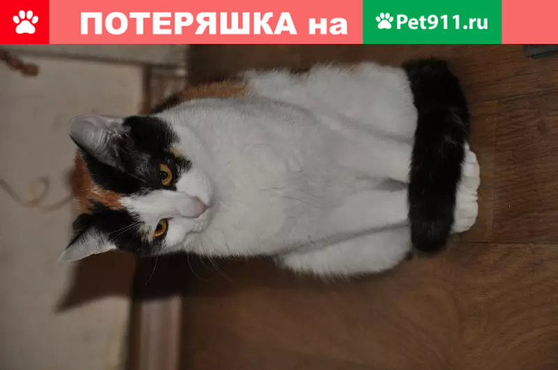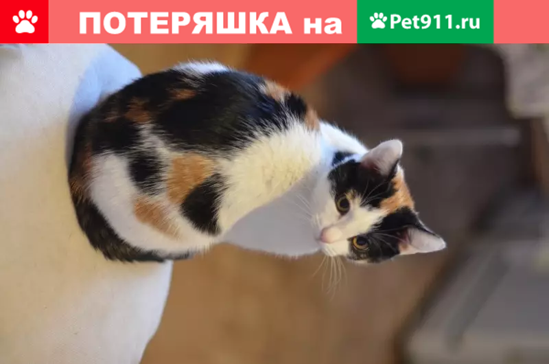 Кошечка, 11 месяцев, гладкошерстная, без породы. Окрас: белая с оранжево-черными пятнами, глаза желтые. Потерялась ночью, упала с балкона. 21 июня 2019. За домом, не во дворе.