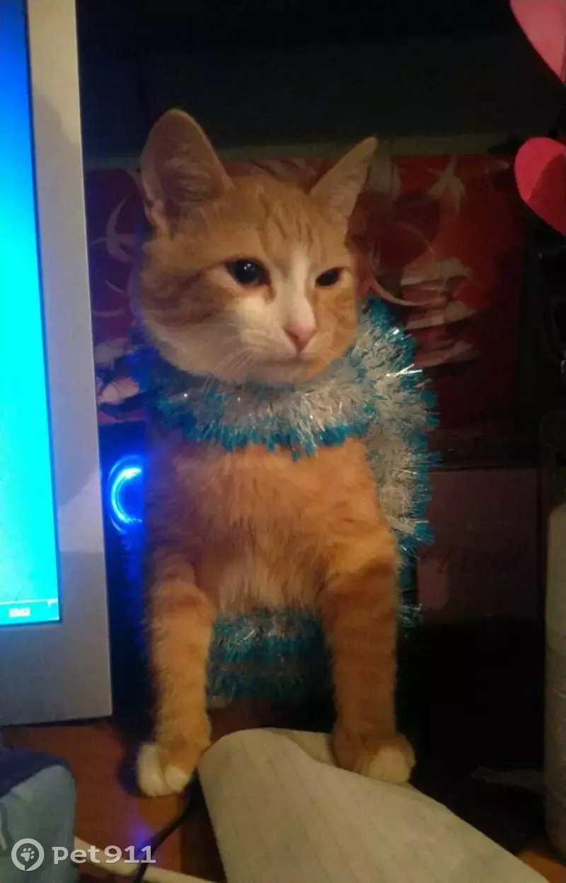Мальчик рыже-белый. Широкая грудь, на лапках 3 носочка и 1 гольфик. Сестрёнка должна была ехать ко мне, вышла с котом на улицу. Не доходя до машины, проехала громкая машина, кот испугался, выпрыгнул из рук и убежал.
