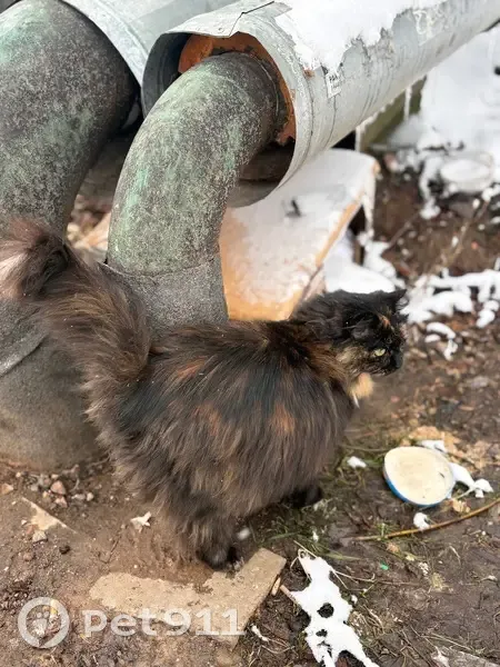 Кошка или кот темного цвета с рыжими пятнами, длинная шерстка. Скорее всего домашняя, так как не боиться людей, очень ласковая, упитанная, шерсть видно что была ранее ухоженная. Неравнодушные люди соорудили ей домик и подкармливают. Всегда сидит в одном и том же месте, возле теплотрассы. Если хозяева так и не найдутся, то заберите кошечку домой, сделайте ей подарок на Новый год