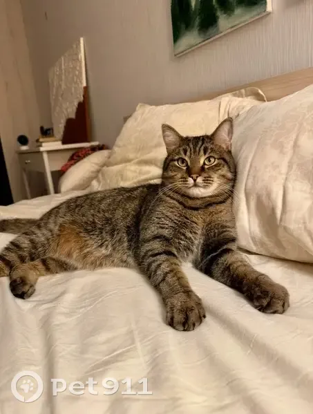 Полосатый, толстенький Кузя. Очень ласковый и пугливый. Будет долго прятаться, но потом выйдет к людям. Очень боится резких звуков. Убежал из машины и спрятался где-то за медицинской клиникой около станции Нахабино.