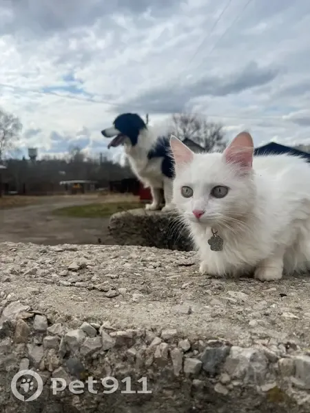 Белая, пушистая, зеленые глаза, розовый ошейник. Ей 10 лет. Всегда гуляла и возвращалась, стерилизованная.