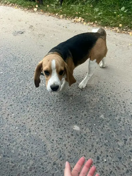 Бигль, мальчик, кличка Чаки, белое круглое пятно над хвостом, был в ошейнике с биркой, на которой написан адрес и номер телефона владельца