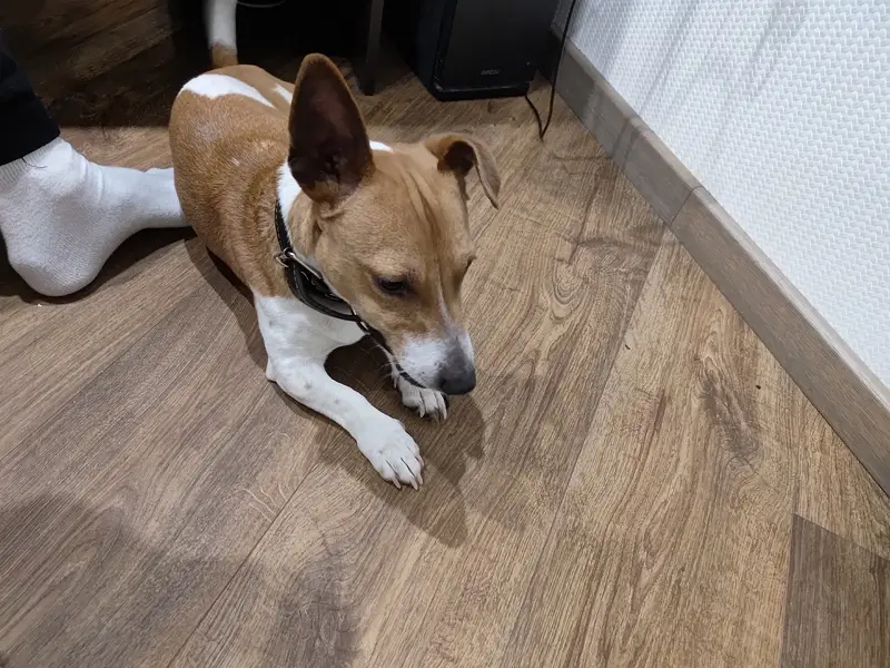 Рыжего с белом окрас , боится чужих людей , любит подходить к собакам , не кусает свет людей , легко приманить чем то вкусный(колбасой ,сыром, собачей вкусняшкой )
