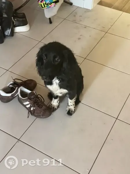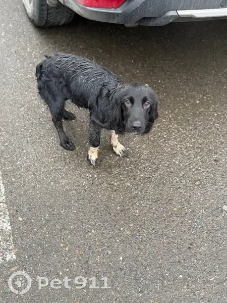 Окрас черный,кроме передних лап,они черно белые,был без ошейника,нашла утром 31.03.2026