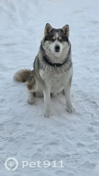 Сибирский хаски, возраст 9 лет. Серо-голубые глаза. Серая с лёгким рыжеватым оттенком. Чёрный ошейник текстильный с кольцом.