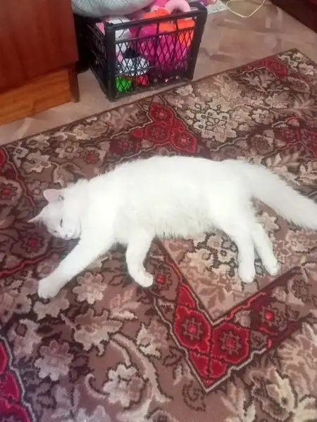 Окрас белый, с зеленым ошейником, домашний на улице не был. Глаза голубые, на голове серое родимое пятно небольшое