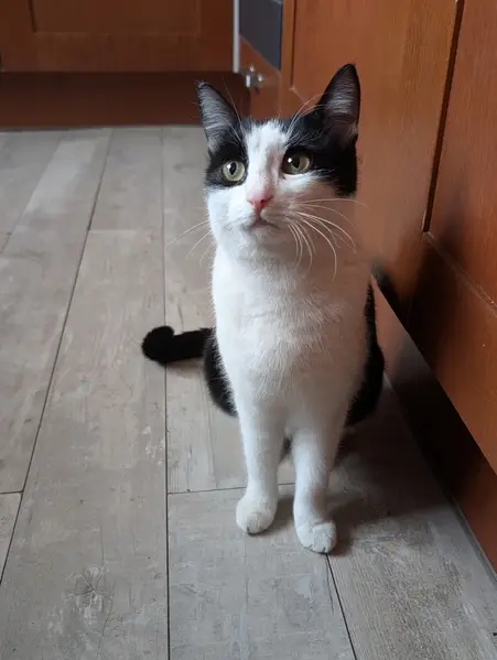 гладкошёрстный, черно-белый окрас, на носике, подбородке и подушечках лап черные пятнышки, правый глазик мутноват, звать Кузя, (откликается ещё на Кусю), возраст 1 годик 4 месяца, кастрирован