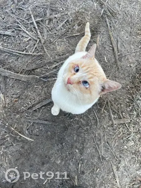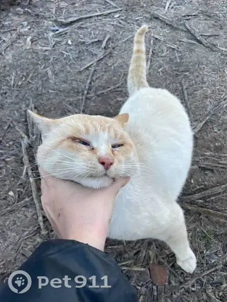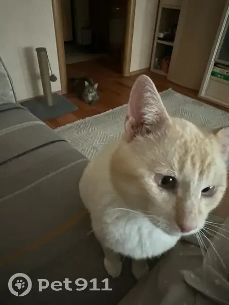 Кот персикового цвета, глаза голубые, косые. Коренастый , кастрирован. На шее ошейник голубого цвета и брелок- маячок. Голос писклявый, контактный.Нижегородская обл Тепло- Троицкое село, СНТ ЗАРЯ, уч 163