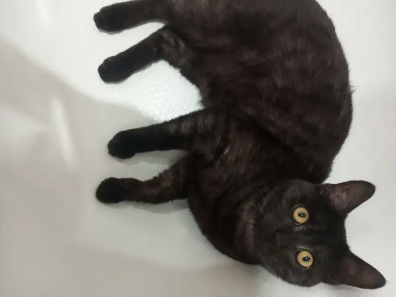 Кот, крупный, чёрный. На животе есть белая метка в виде галочки. Кастрирован. Контактный, напуган. С улицы забрали