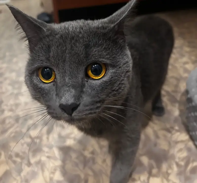 Окрас полностью серый, шерсть короткая, хвост длинный, два передних клыка торчат. Сегодня ночью выбежал из квартиры