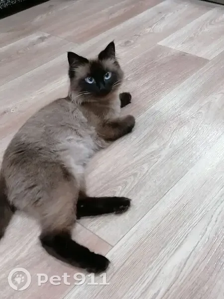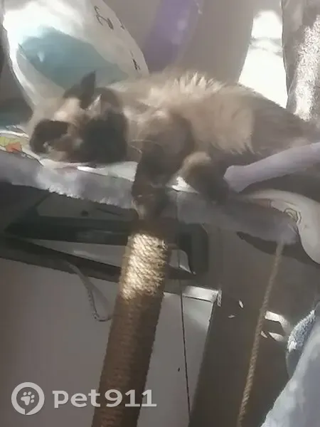 Окрас у кошки похож на сиамский, но сама кошка длинношерстная. Мордочка у нее черная, вместе с ушами, лапки наполовину черные, хвостик тоже черный, туловище серо-белое. Также у кошки голубые глаза. Иногда вместо мяуканья пищит