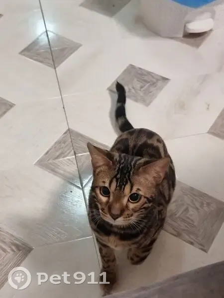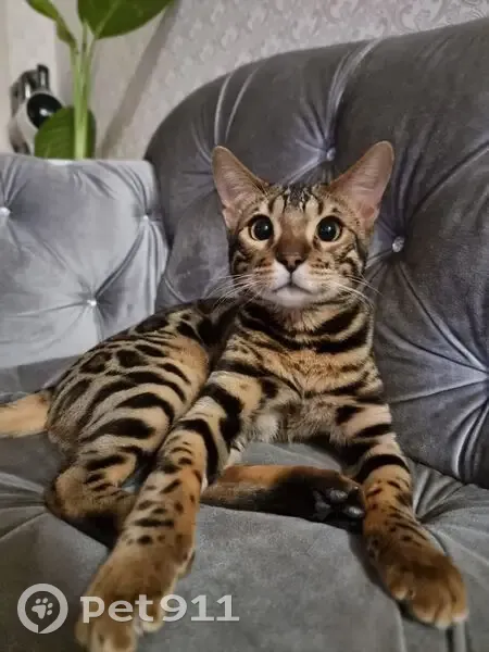 Окрас розетка на золоте, очень пугливый котик, любит играть с перьями, Пропажа была замечена утром,ночью он спал со мной,в ногах, позже он спустился на первый этаж, миски с водой едой были опустошены, в лотке были продукты его жизнедеятельности, до 10 утра его не искали т. К. Он очень любит спать и когда сытый,на "кис кис" почти не отзывается Очень вас прошу помочь найти его, Саймон очень любим в этом доме,он часть нашей семьи, если заметите хоть немного схожего кота,пожалуйста, свяжитесь с нами