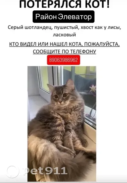Пропал в районе Элеватора. Просто гулял и не пришел. Скорее всего кто-то взял себе. Верните за вознаграждение пожалуйста (10000₽) Серый кот с густой, мягкой шерстью. Пушистый хвост — большой и пышный, как у лисы. Глаза крупные, выразительные, янтарно-зелёного оттенка. Кот домашний, ласковый, его очень ищут и ждут в семье.
