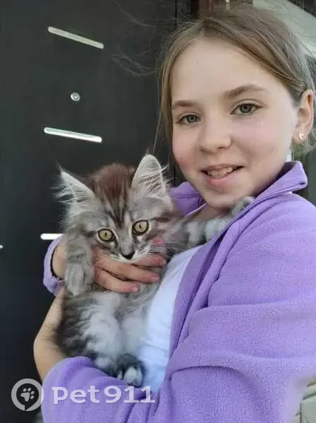 Серый окрас ,с тёмными еле заметными пятнышками по бокам живота, ярко янтарные глазки, шотландской породы, чем-то похож на мейкуна,немного кусается, очень любит играть, добрый и ласковый