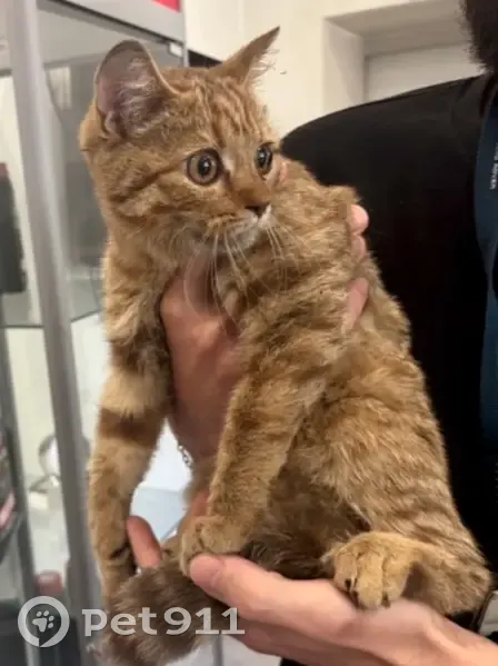 Найден кот (предположительно котенок). Очень ласковый, легко идет на контакт. Окрас ближе к рыжему цвету, с примесью песочного или коричневого оттенка, полосатый. Порода похожа на скоттиш страйт. Залез под машину предположительно в районе Маршала Баграмяна д.3 Сейчас он находится в автосервисе