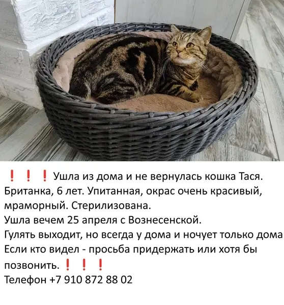 Найдена шотландская вислоухая кошка (скоттиш-фолд) с окрасом табби (полосатый) в коричневых тонах. Возраст 1 год, возможно меньше. Найдена под лестницей около подъезда, голодная, к людям не выходит. Еду принимает. Очень пуглива.