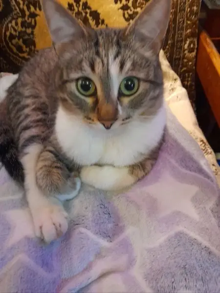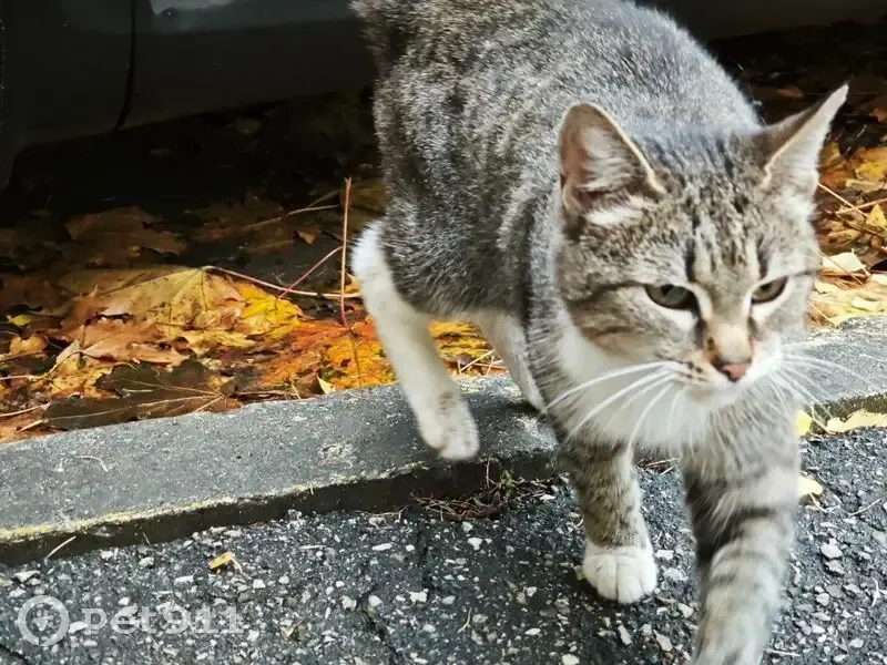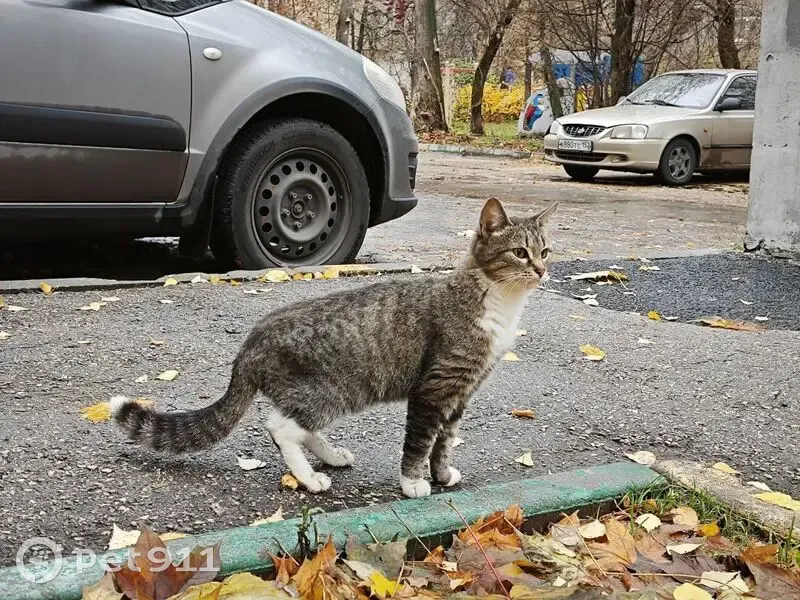 Серая с полосками кошка, белая грудка, белые лапки и кончик хвоста. Появилась во дворе, как из ниоткуда. На вид явно домашняя, очень ласковая, мурчалка. Голос немного хриплый.