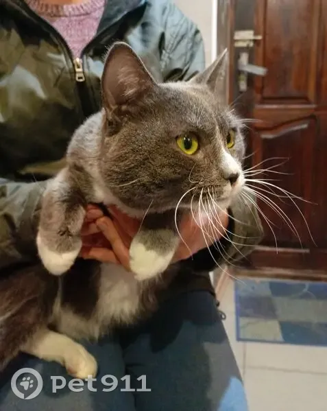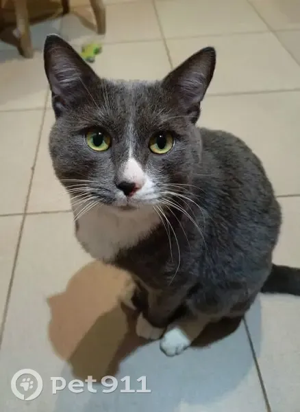 Возраст на вид 10-12 месяцев. Из примет: цвет серый с белым, чёрное пятно на носу, шерсть короткая. Кот пришёл сам, обнаружен в саду, был очень голодный, просился на руки и пытался проникнуть в дом. Видно, что когда-то кот был домашним, но, похоже, потерялся: очень ласковый, просится на руки, гладится и мурчит, приучен к лотку. Потерялся, судя по всему, довольно давно, т. К. Найден был худым и голодным - на улице зимой ему не прожить, подшёрстка нет.