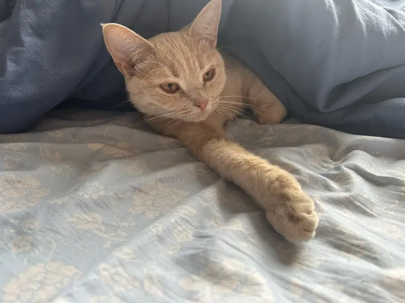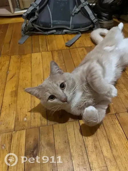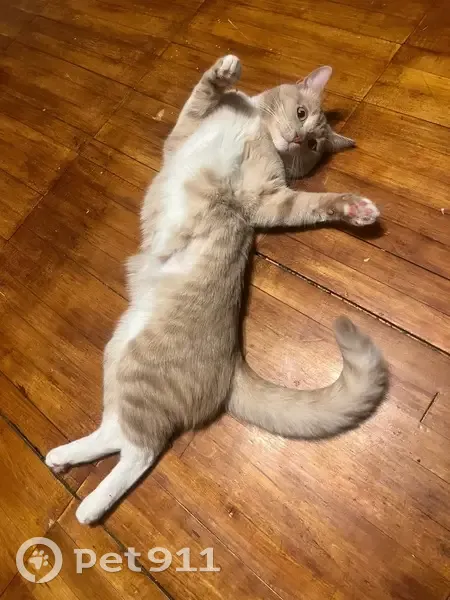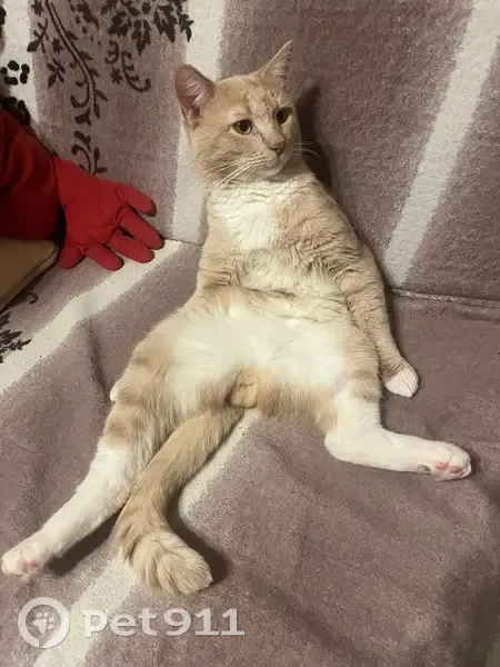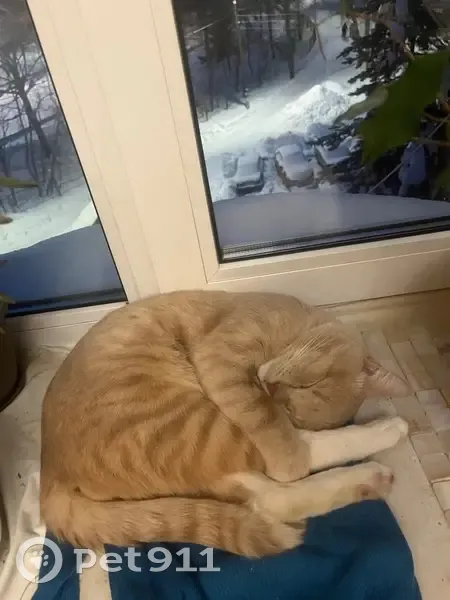 Цвет персиковый с неяркими полосами и с белым. Найден в подъезде дома на Васюнина 1к1. Кот был сильно напуган и истощен. Не помню точно, забрал примерно с 8 по 11 января 2026 года. По виду молодой. Не кастрирован
