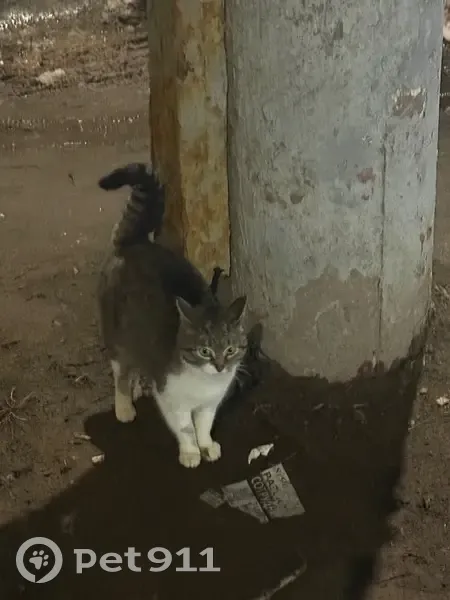 Кошка сидела у фонарного столба. Грудка и лапки белые. Боится шума автобусов и машин, к людям подходит и пытается прижаться.