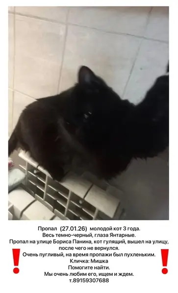 Найден кот или кошка,черный с ошейником.Проблемы с одним глазом.Ласковый.