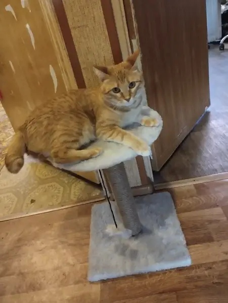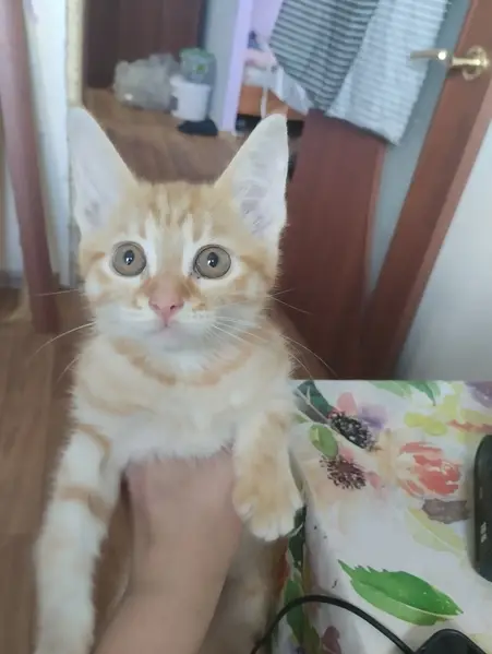 По виду малышу не больше 2-2,5 месяца .Пол не определили.Рыжий в полосочку .Очень ласковый,трется и мурчит