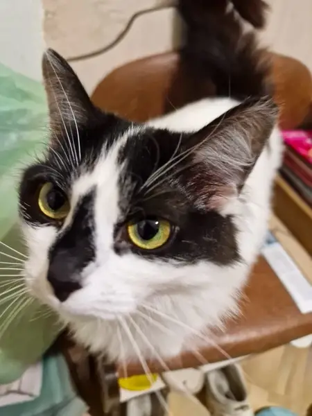 Котик на улице' видно что домашний ' чистенький' сидел под снегом на лавочке' вероятно выскочил с квартиры' завела в подьезд погреться' покормила. Залез под батарею. Территориально ул народная' звонить и писать +79648302046 ольга . Хозяин скорее найдись' в подьезде живут собаки' и ему там не безопасно.