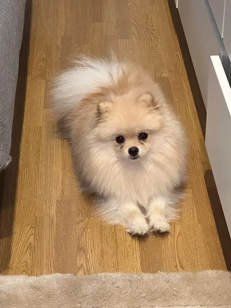 Довольно крупный шпиц, скорее всего мальчик. Синяя шлейка в цветах Олимпиады в Сочи 2014 (цветные ромбы, преобладает синий цвет). Собака чистая, контактная, не агрессивная.