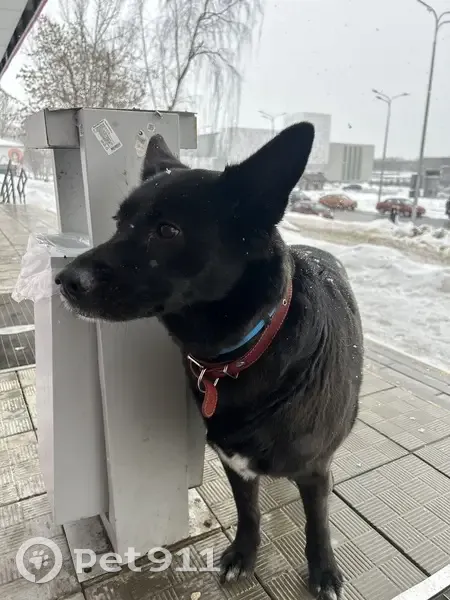 Белое пятнышко на груди. Бордовый ошейник и голубая повязка (ошейник) снизу. Молодая и ухоженная собака. Добрый, к людям походит и дает себя погладить. Хозяева, отзовитесь