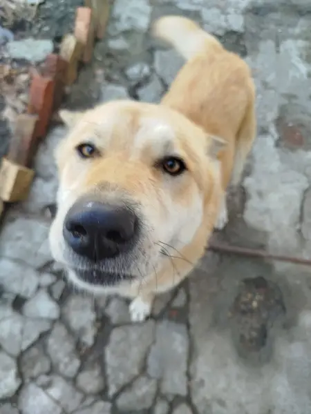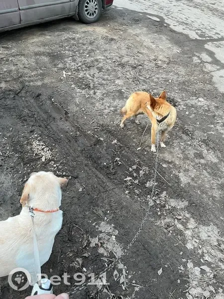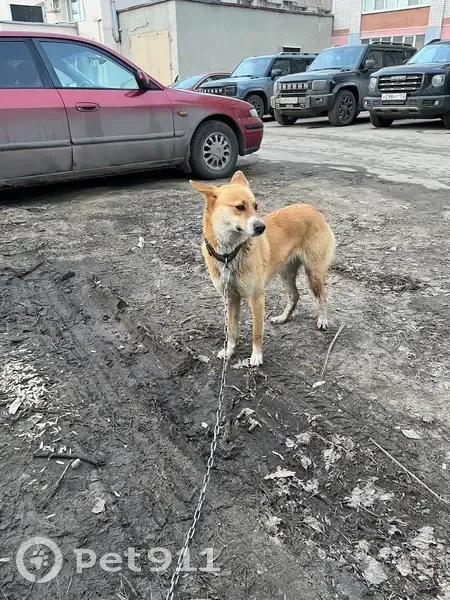 Рыжая собака. Маленькая, пугливая. К ошейнику была прицеплена цепь. Предположительно девочка